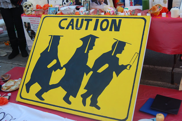 It was so cool. As the sun was getting ready to set the Aztec dancers went around and blessed all the altars with copal. After the blessing people lit the candles on their altars.